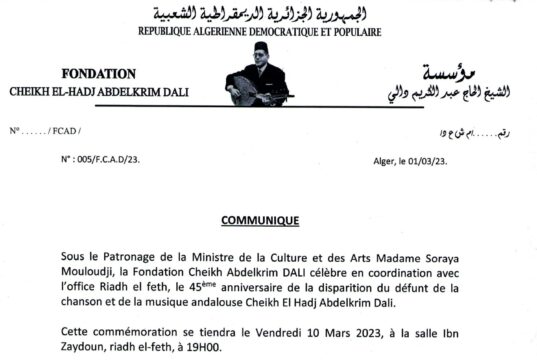 Communiqué et programme: 45 ème anniversaire du décès de Cheikh Abdelkrim Dali en mois de mars 2023