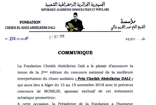 La fondation Abdelkrim Dali, par la voix de sa présidente, animera, le 18 février 2018, une conférence de presse. Pour de plus amples détails,...