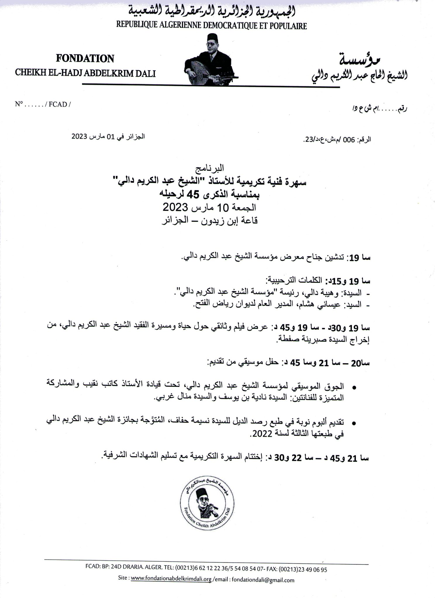 45 ème anniversaire du décès de Cheikh Abdelkrim DALI en Mars 2023 Communiqué : Commémoration du 45ème anniversaire du décès de Cheikh Abdelkrim Dali...