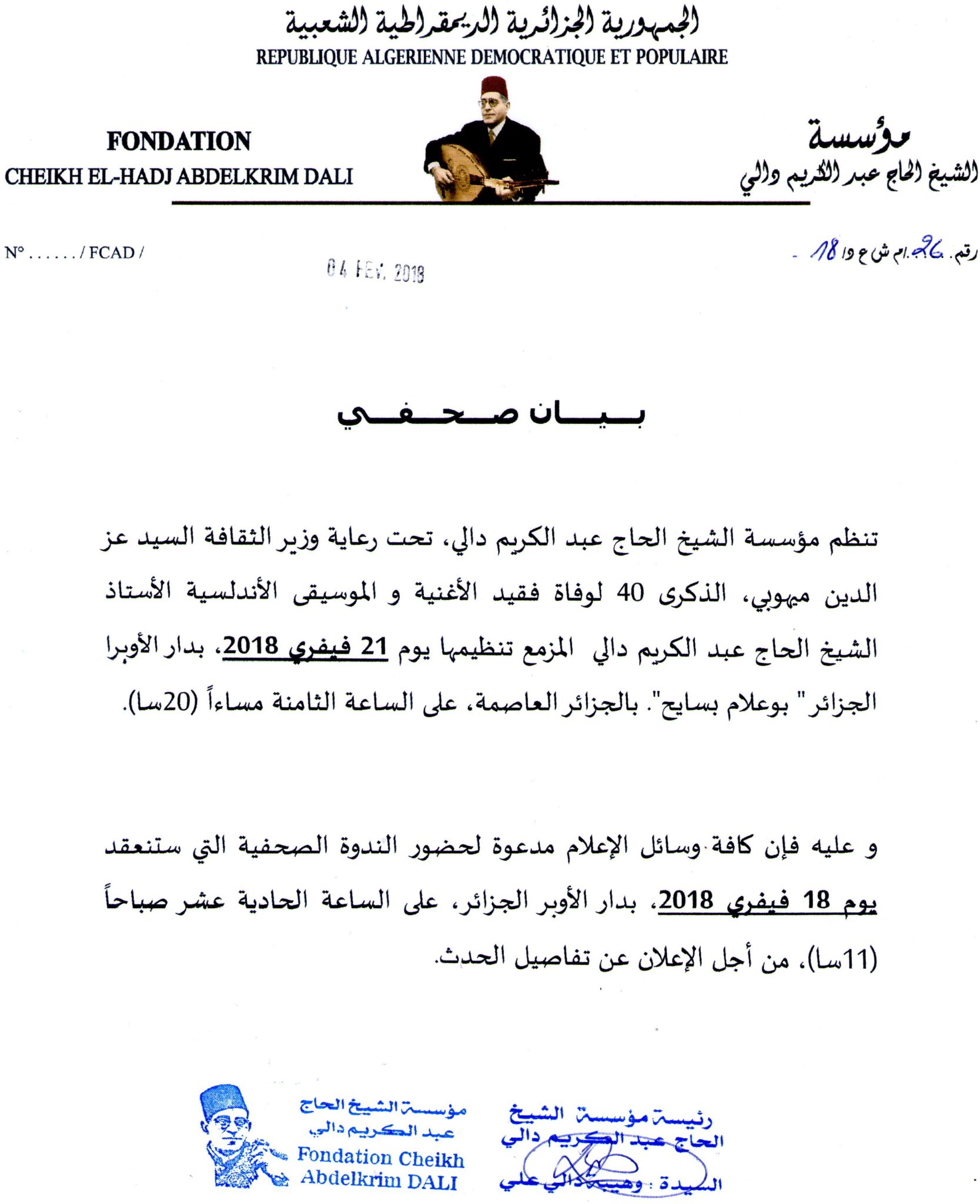 Dans un communiqué publié par la Fondation, il a été annoncée la tenue de la cérémonie commémorant le 40ème anniversaire de la disparition du Cheikh El Hadj Abdelkrim Dali en date du 21 février prochain à l’Opéra d’Alger. Auparavant, une conférence de presse y sera organisée. A cette occasion, l’ensemble de la presse y est conviée.