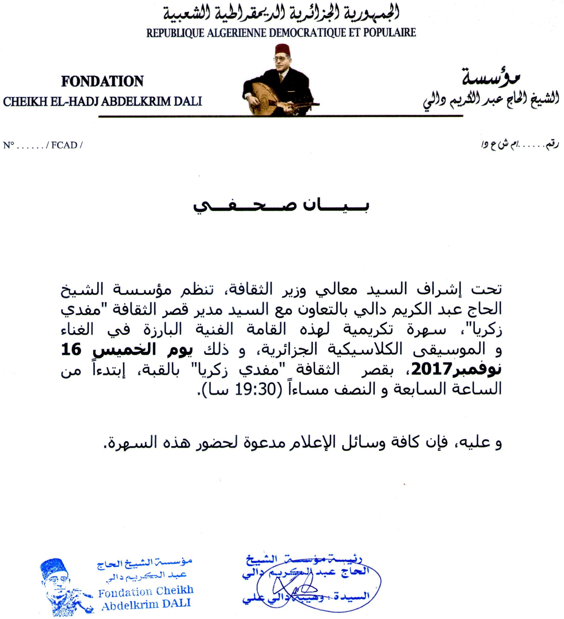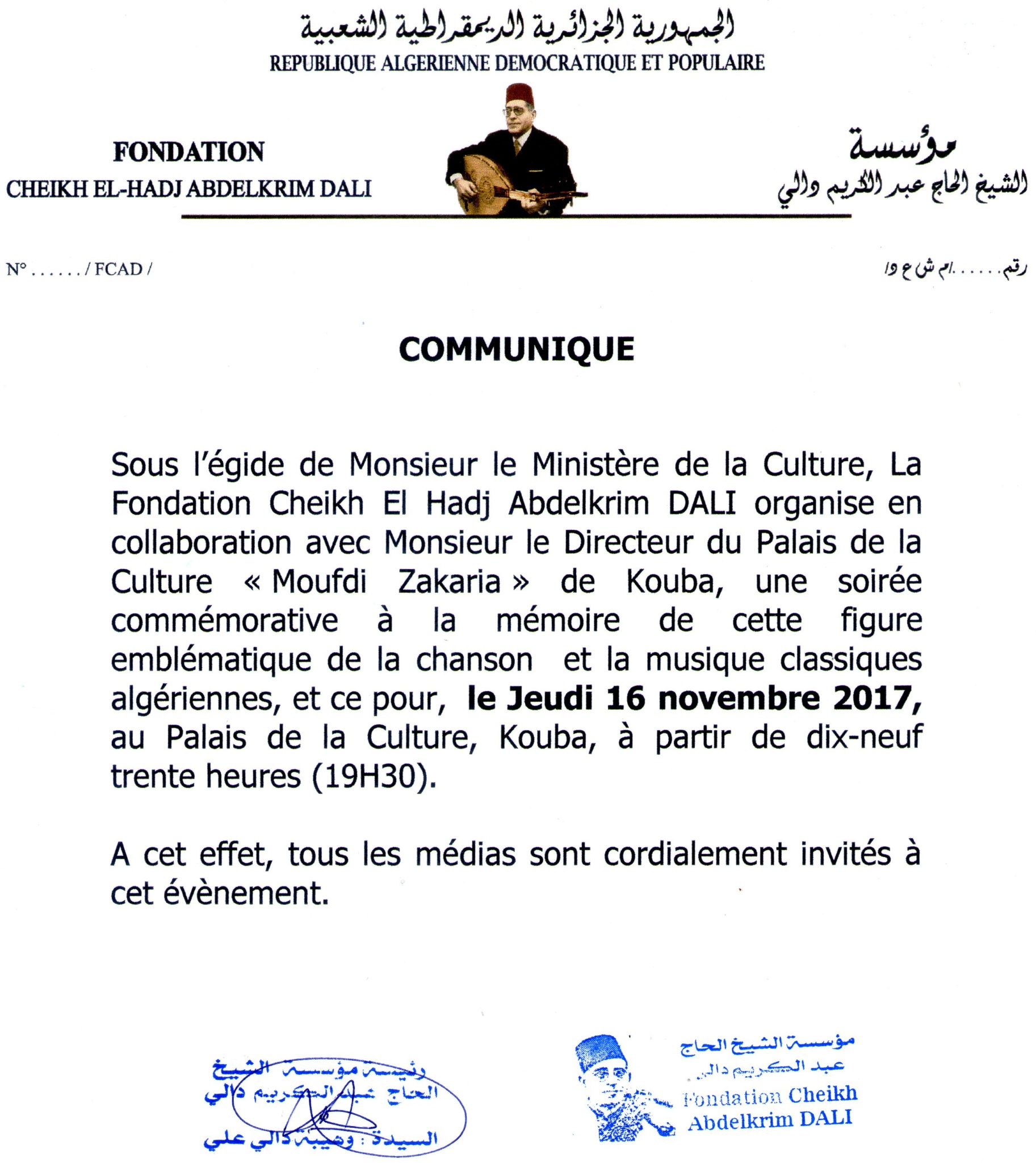 Accueil EN UNE Communiqués : Soirée commémorative à la mémoire de Cheikh Abdelkrim Dali au... EN UNE Communiqués : Soirée commémorative à la mémoire de Cheikh Abdelkrim Dali au Palais de la culture « Moufdi Zakaria » 07/11/2017 PARTAGER Facebook Twitter